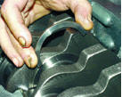 8. Вставьте вкладыши в крышки коренных подшипников в соответствии с метками, сделанными при разборке. При этом стопорные усики вкладышей должны войти в пазы крышек. Смажьте вкладыши моторным маслом.
