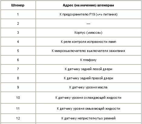 четыре сигнализатора незакрытых дверей. Адреса штекеров блока даны в таблице