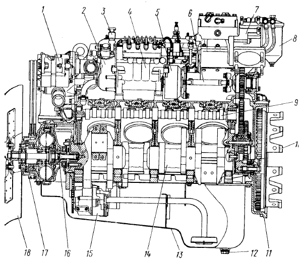 1 - генератор; 2 - насос топливный низкого давления; 3 - насос топливоподкачивающий ручной; 4 - насос топливный высокого давления; 5 - муфта автоматическая опережения впрыскивания топлива; 6-полумуфта ведущая привода топливного насоса высокого давления; 7-патрубок соединительный впускных воздухопроводов; 8 - фильтр тонкой очистки топлива; 9 - вал кулачковый; 10 - маховик; 11 - картер маховика; 12-пробка сливная; 13-картер двигателя; 14-вал коленчатый; 15 - насос масляный; 16 - валик привода ведущей части гидромуфты; 17 - шкив привода генератора; 18-крыльчатка вентилятора
